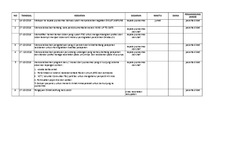 Elemen penilaian maksud kriteria regulasi dokumen bukti observasi fakta dan analiss ep 1. Kemudian dilanjutkan dengan evaluasi terhadap penyelenggara (sarana, fasilitas, panitia, dll). Kesehatan di puskesmas antara lain bidan, perawat, penyuluh kesehatan. Tentang contoh format rtl suatu kegiatan by mifta_rohim in types > creative writing e miftapelatihan Tim terpadu terdiri dari dokter umum, dokter gigi, perawat, bidan, ahli gizi, petugas farmasi, analis laboratorium (sesuai ketersediaan tenaga di puskesmas).